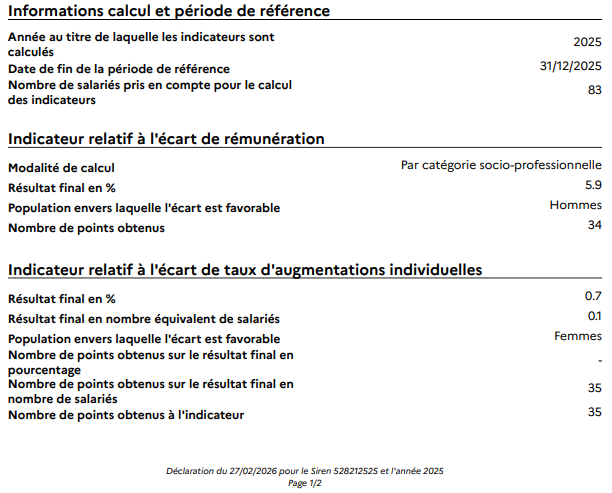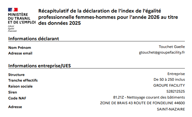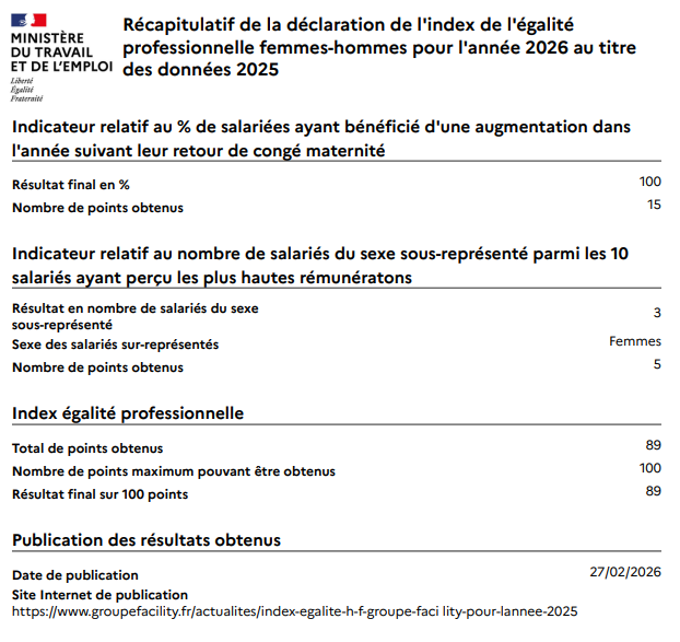 Index égalité H/F Groupe Facility pour l’année 2025